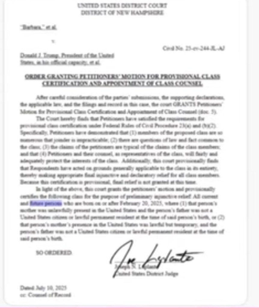 In a July 10, 2025 ruling, U.S. District Judge Joseph Laplante issued a nationwide preliminary injunction blocking former President Trump’s Executive Order 14160, which aimed to abolish birthright citizenship for children born to non‑citizens. The legal challenge—filed as a class-action by the ACLU—asserted that unborn children of non-citizens are protected under the Constitution. In effect, they argued that denying citizenship at birth would irreparably harm both pregnant immigrants and their unborn babies.