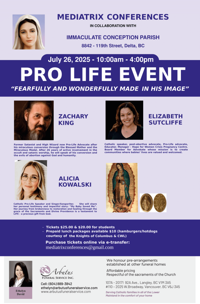 I’m honoured to be a keynote speaker at the upcoming Mediatrix Conferences Pro-Life Event, taking place Saturday, July 26, from 10:00am – 4:00pm at Immaculate Conception Parish in North Delta, BC.